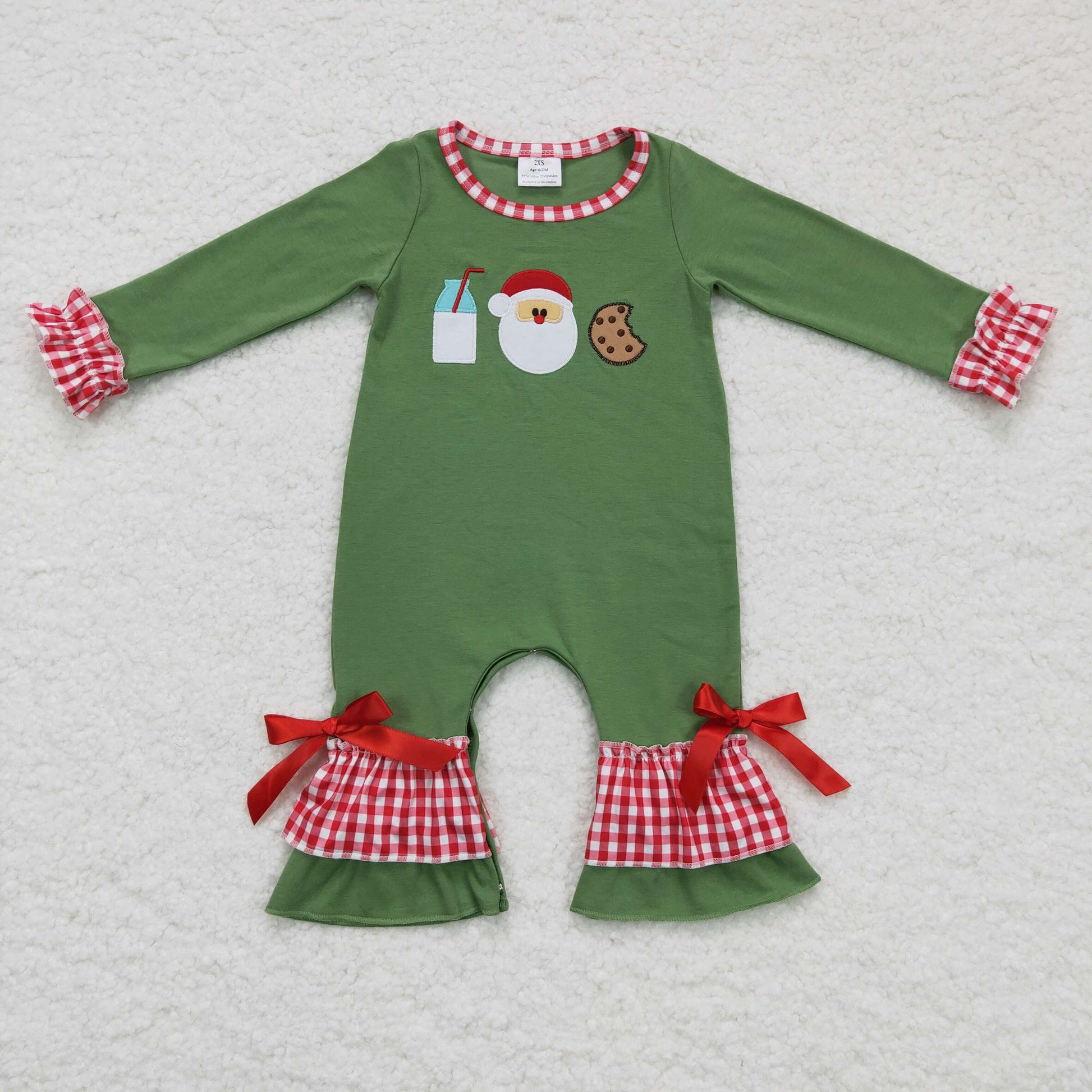 Christmas Green Embroidery Cookies Santa Baby Girls Romper