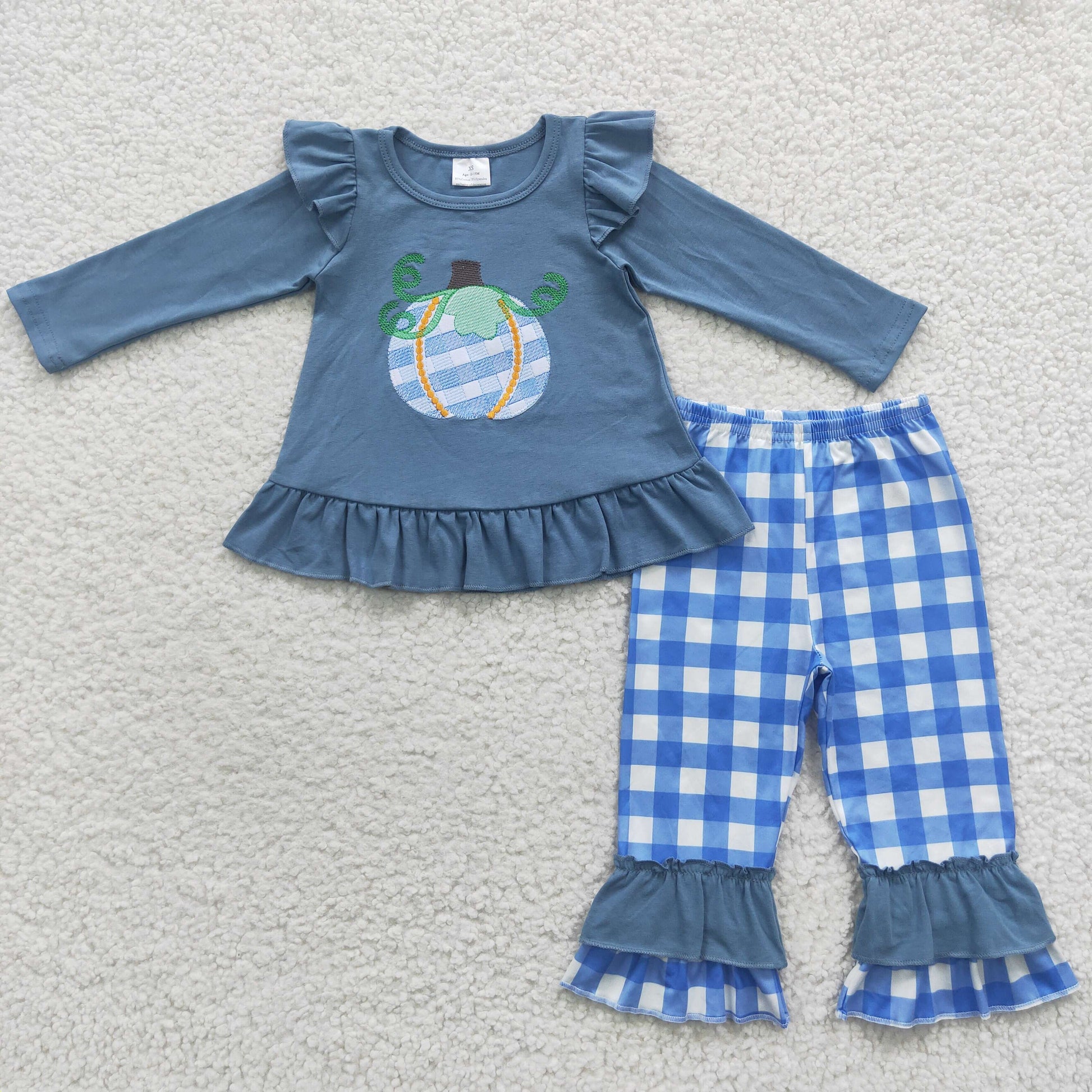 Fall Outfits Embroidery Pumpkin Ruffle Girls Set