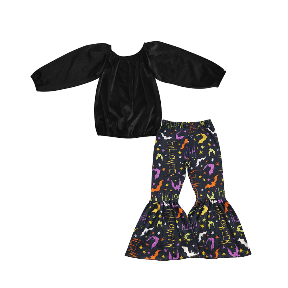 Halloween Black Velvet Ruffle Girls Top Bell Pants Girls Set