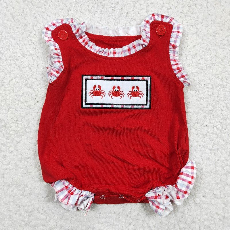 SR0156 Summer red plaid embroidered crab Girls Romper (usa warehouse)